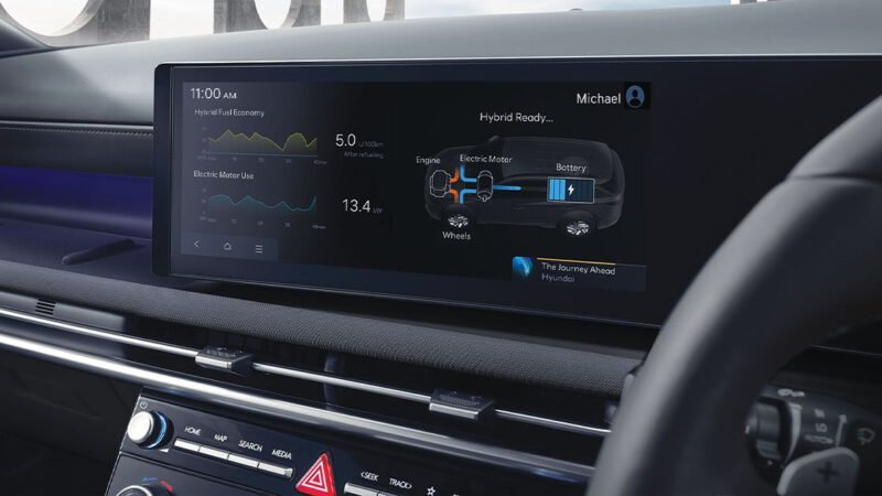 Temukan informasi performa mesin hybrid the new TUCSON melalui layar infotainment.
